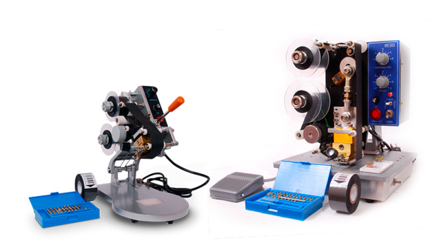 Maquinas de muy simpe operación que trabajan con una cinta térmica e imprimen sobre bolsas plásticas u otro tipo de envase flexible, el numero de lote del producto y las fechas de fabricación/vencimiento. Viene en dos versiones, una de uso manual para pequeñas producciones o elaboraciones artesanales y otra mecánica con motor eléctrico. Se trata de un auxiliar indispensable tanto para cumplimentar las normas bromatológicas como para obtener una buena presentación del producto.