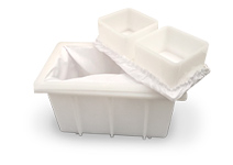 LA RAIZ ofrece moldes de plástico inyectado, (no microperforados), que vienen provistos de una tela desueradora removible que tiene la forma del molde y permite lograr un acabado superficial perfecto, lo que es especialmente importante para quesos de larga maduración o para exportación (tipo Romano, Goya y Sbrinz).